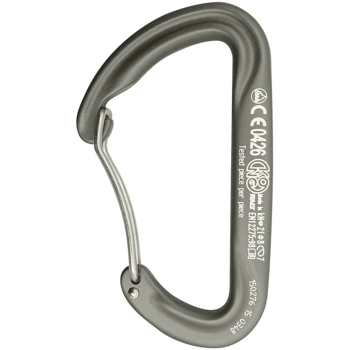 The newest Kong wire gate carabiner features semi-bent gate for easy clips on both the bolt hanger and the rope. Protective hood reduces the possibility of the gate opening during a fall. Masterfully crafted in Italy.