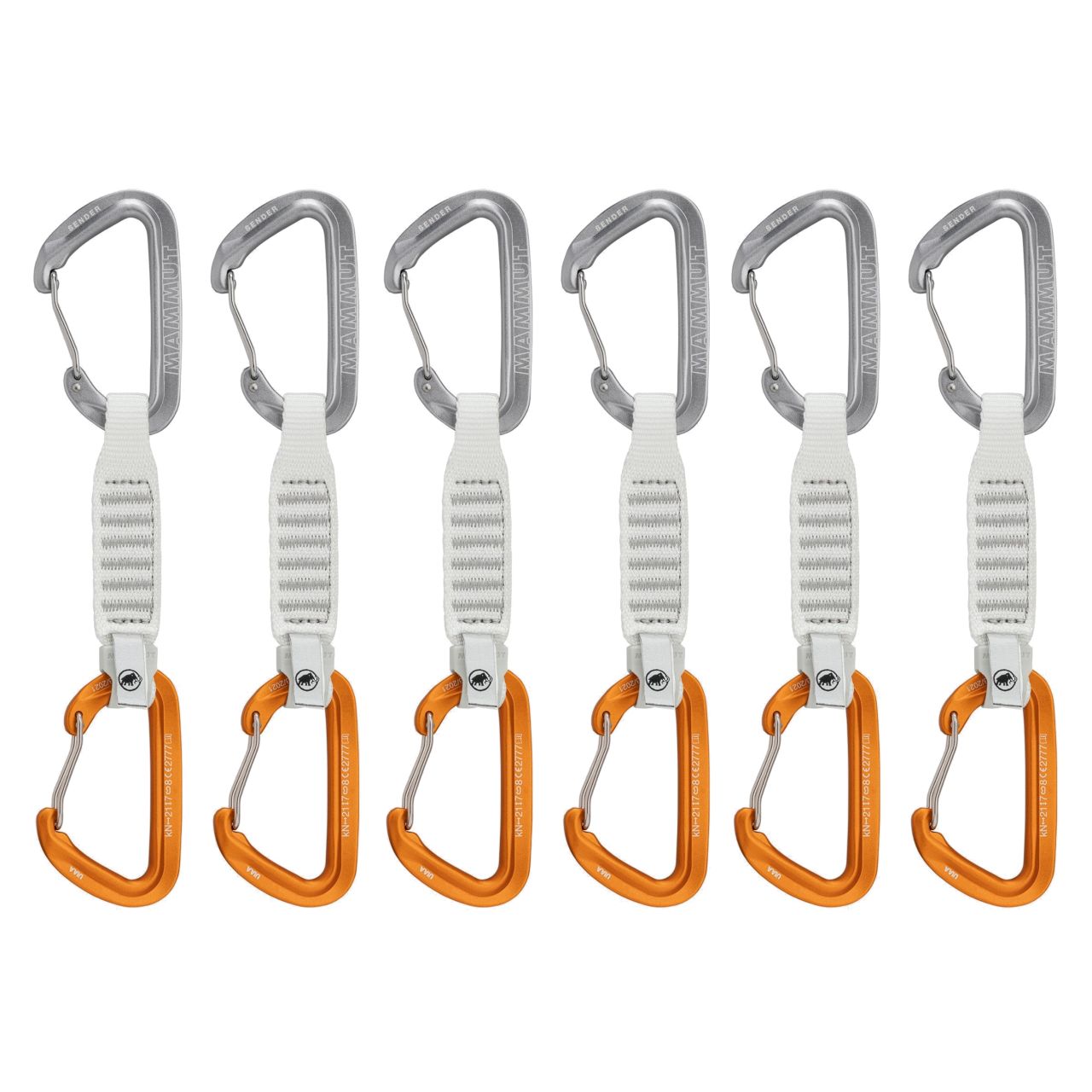 Mammut Sender quickdraws are designed for alpine climbing and high-performance sport. The combination of extremely light, compact carabiners with wire gates and Dyneemaยฎ slings delivers an ideal balance of weight and performance. The weight-saving wire gates, designed for year-round use, are fully functional even in snow and ice and have less gate flutter and shutter. The sling varies in width and provides a firm grip; a robust sling protector keeps the lower carabiner in place and reduces wear. The bright orange indicator shows that the sling and protector are attached correctly to the carabiner. For climbers looking for the lightest keylock quickdraws for long routes and hard sends.