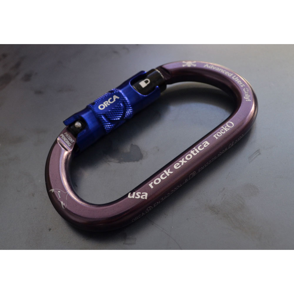 The Rock Exotica rockO ORCA-Lock features a unique autolock sleeve/gate that can be set in the unlocked position. When you open the gate it is just like opening a non-locker, but the act of opening the gate “triggers” it and when the gate closes it will autolock just like a regular autolocking carabiner. Made in USA.